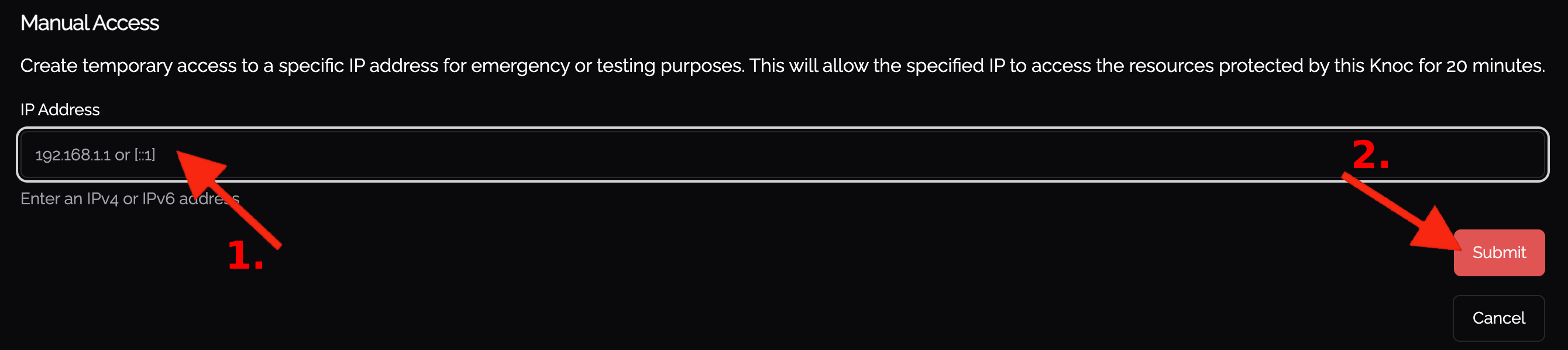 When editing the Knoc, you're able to add manual access to whatever IP you need, giving access in a break glass scenario.