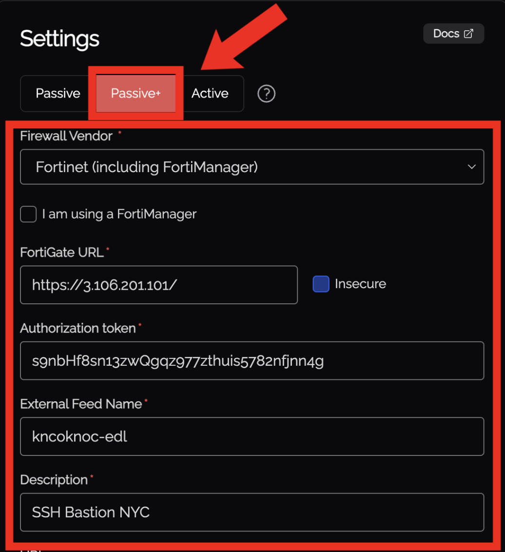 Passive+ mode combines an EDL (allowlist) with real‑time dynamic entry push. FortiGates poll the Knocknoc allowlist on a schedule for consistency reconciliation, while the agent pushes individual IP entries for near‑instant propagation.