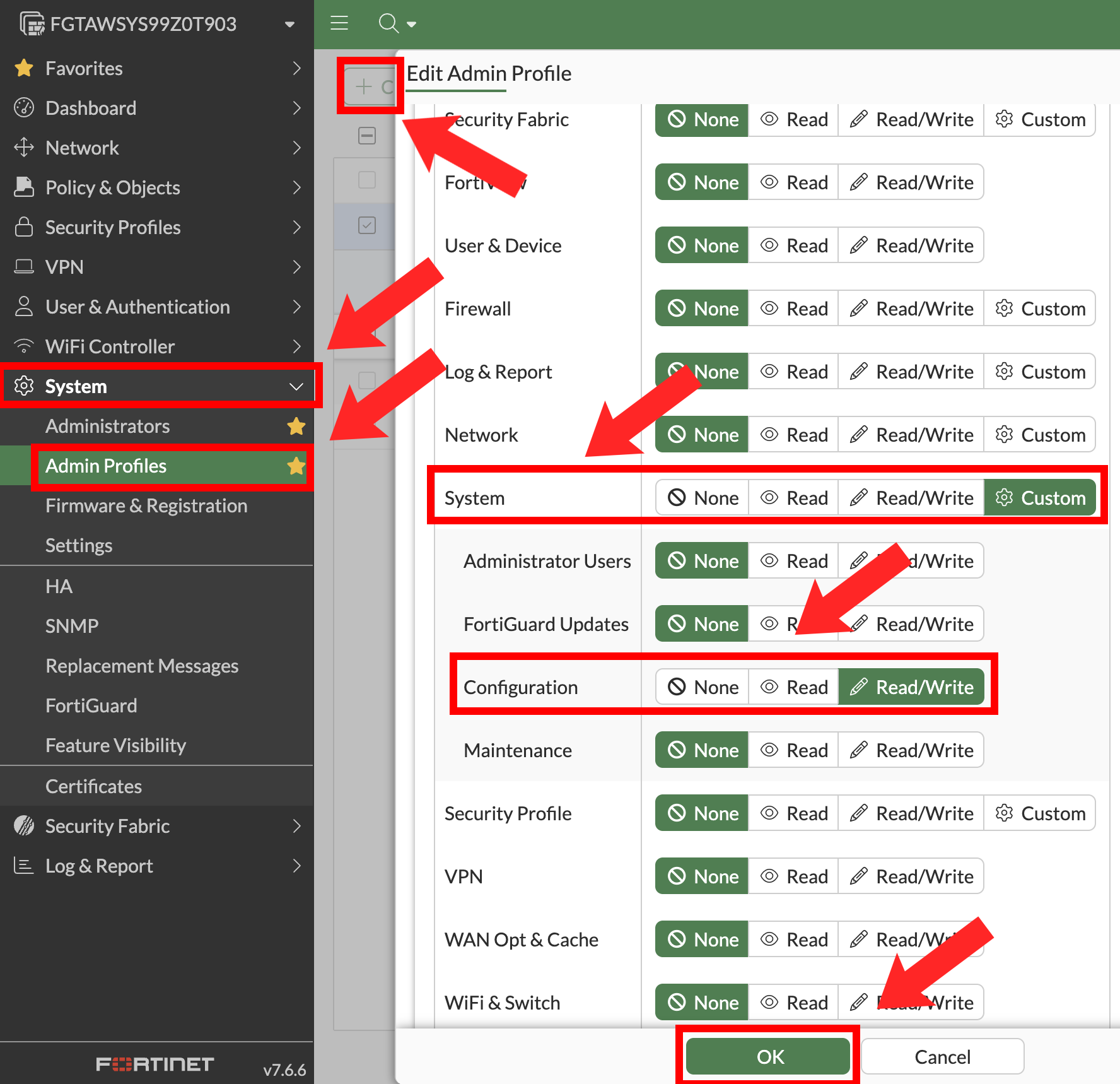 - FortiGate: System > Configuration (Custom) Read/Write