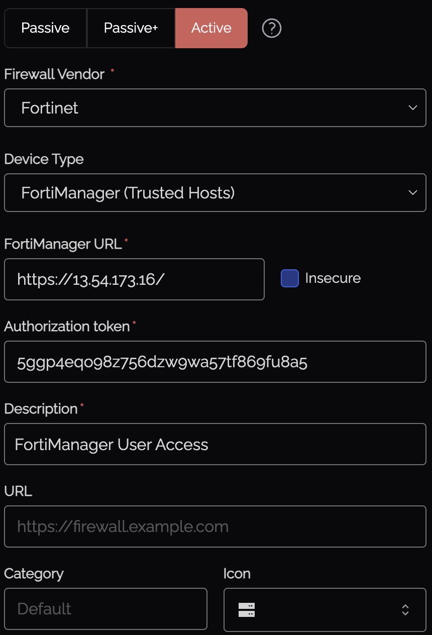 | Active | FortiGate (Direct) | REST API Admin with Firewall read/write (least privilege profile recommended) |
