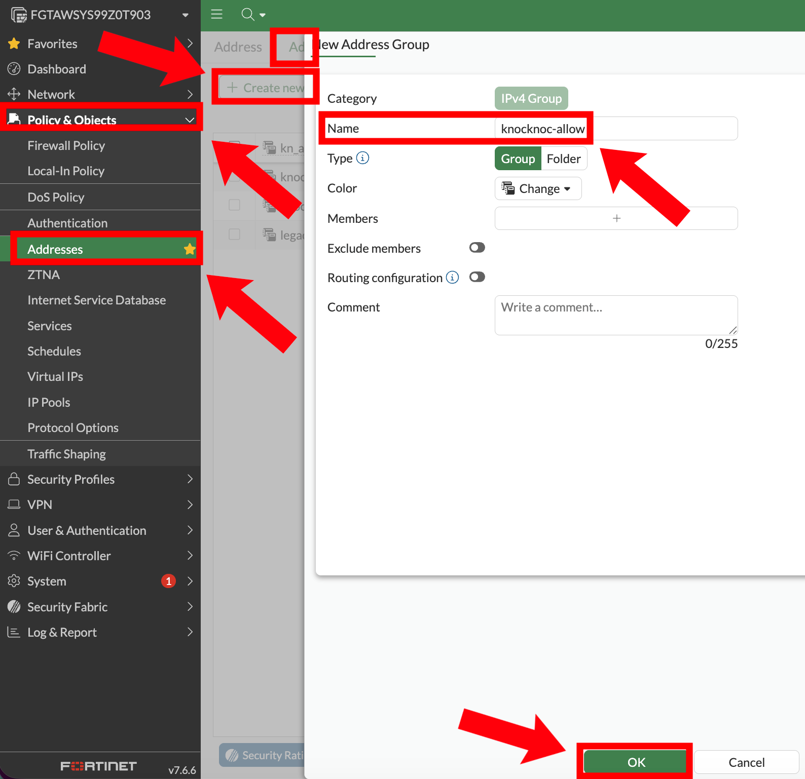 - ✅ (FortiGate) Address group exists and firewall policy references it