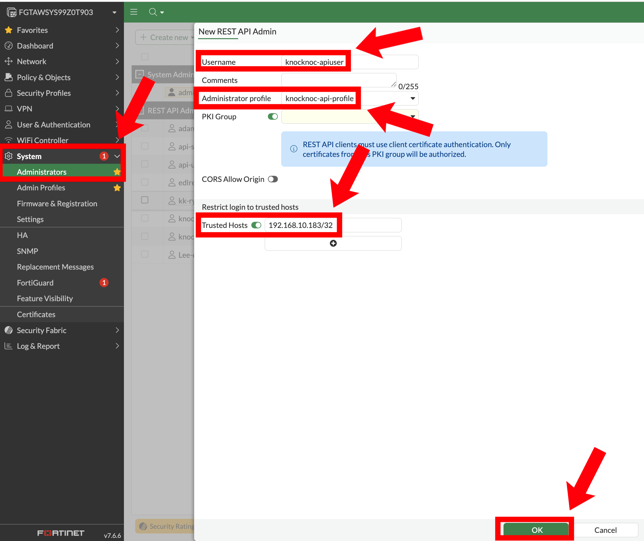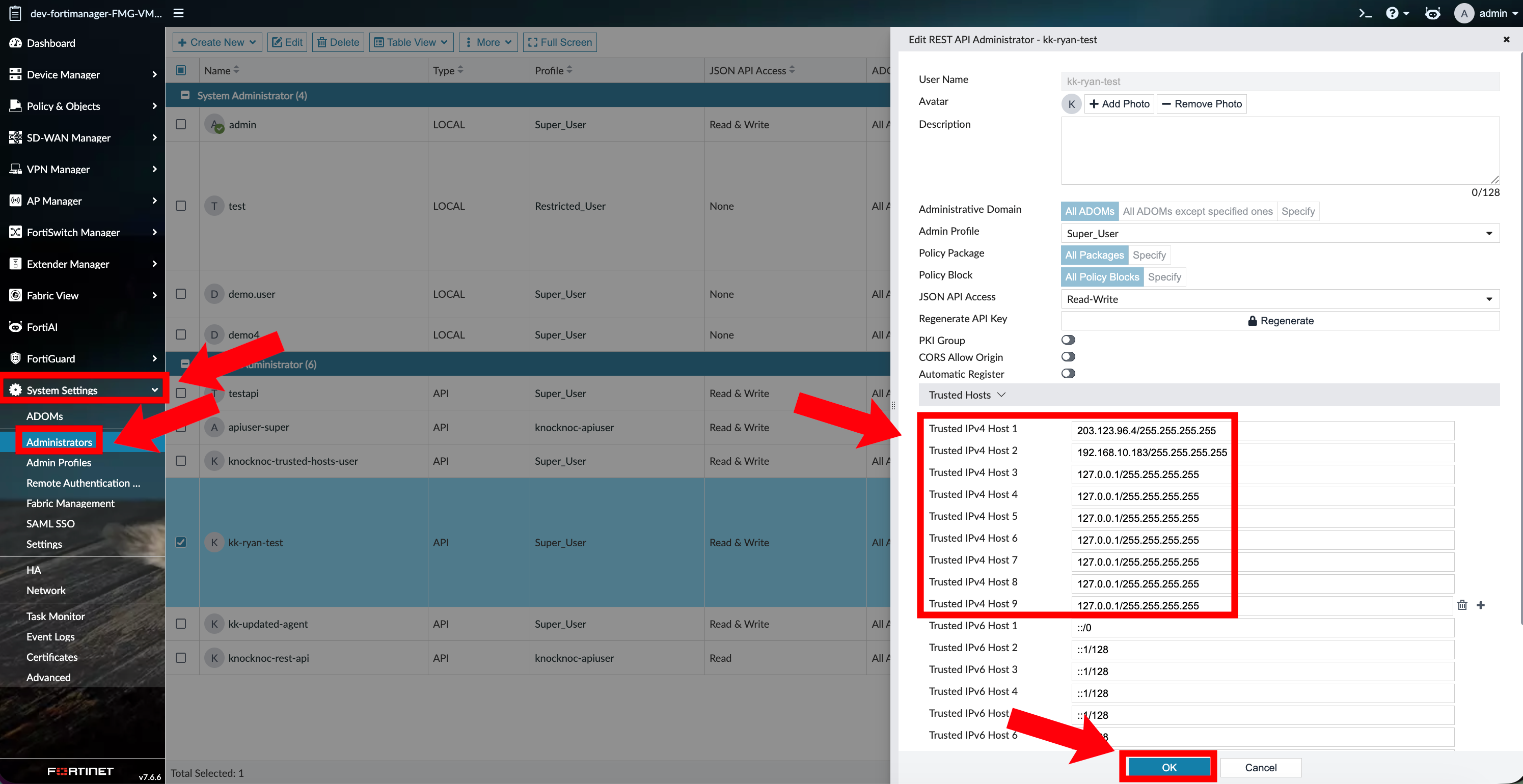 - Creating administrators for the FortiManager API - API user creation