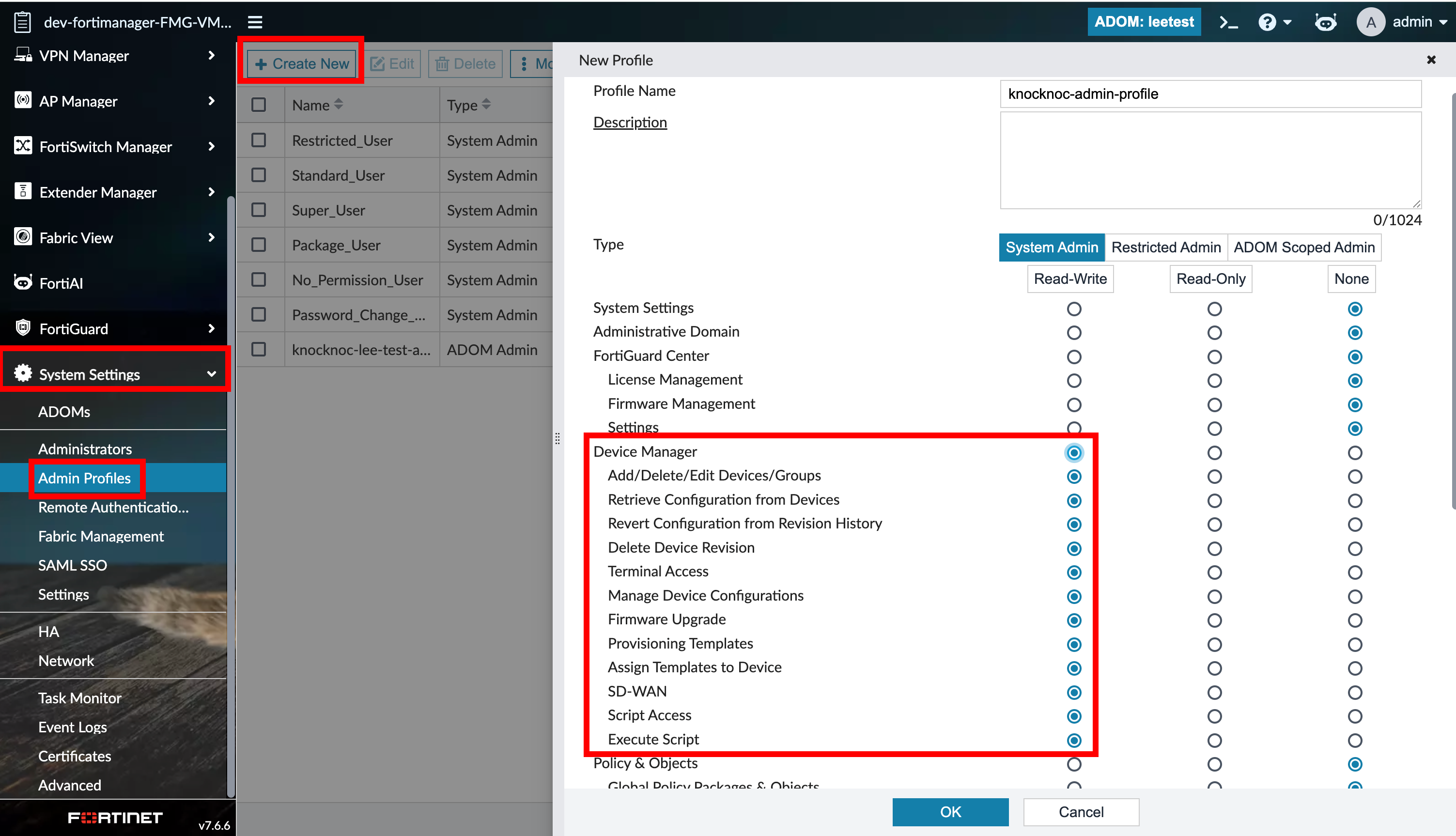- FortiManager: Create an Admin Profile with Read-Write on Device Manager, everything else can be set to 'none'