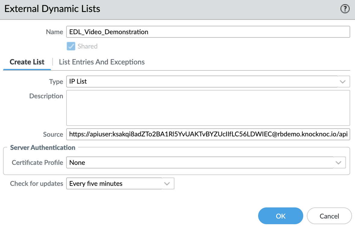 The Basic Auth URL can be copied from the above and pasted into the 'Source' for the EDL, within Palo Alto.