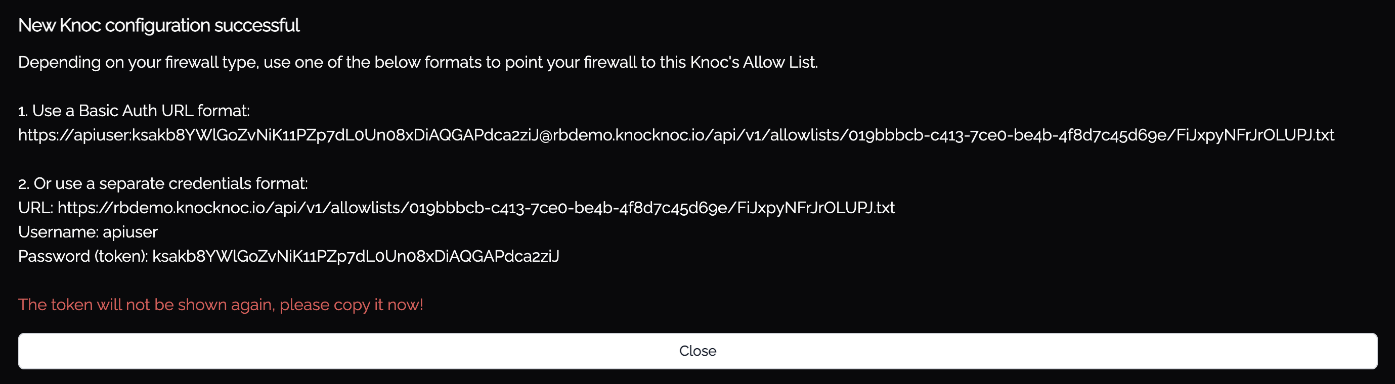The password/token will not be displayed again from within Knocknoc. Be sure to copy it!