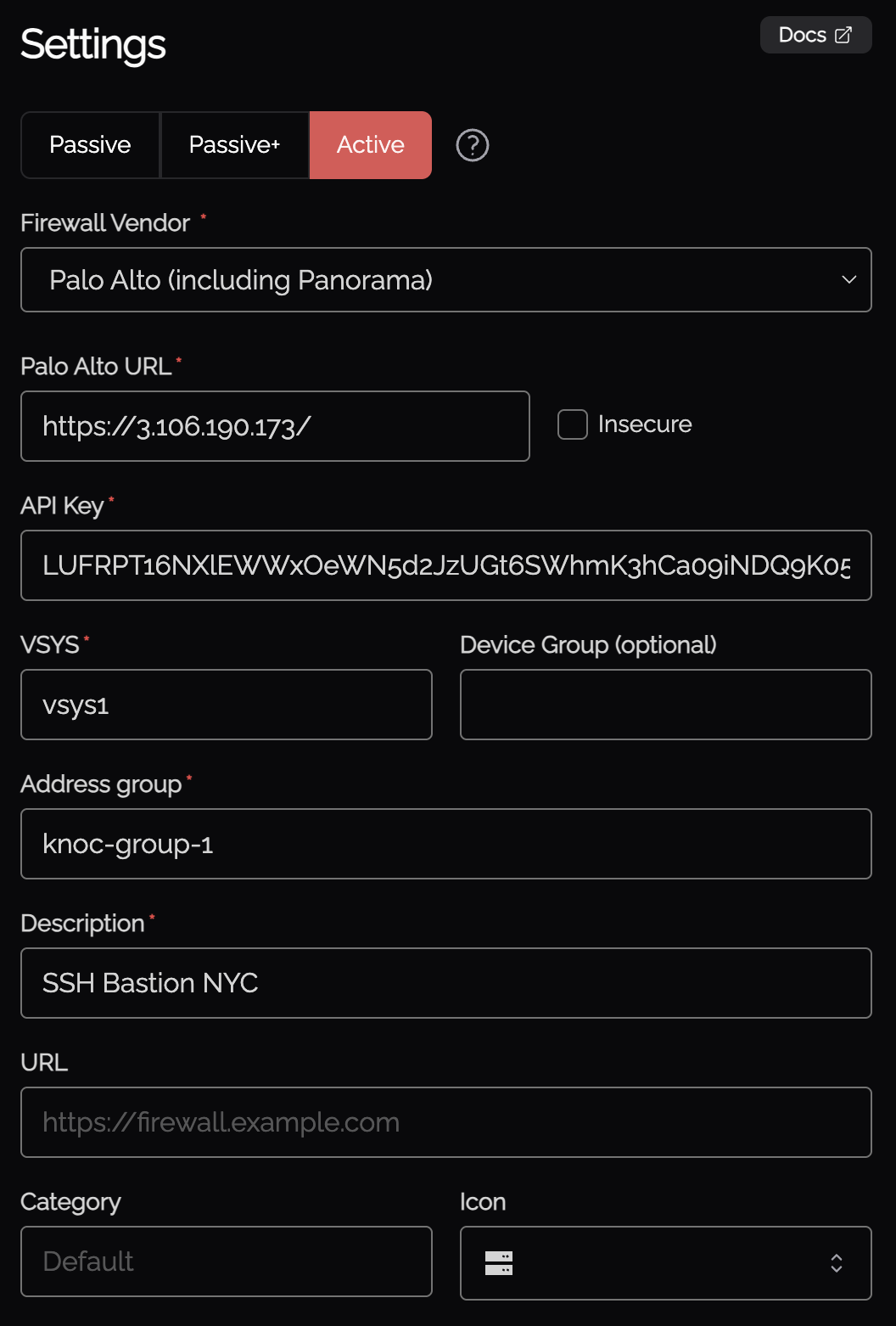 - Configure the Knocknoc Server: Set up an Active Knoc, noting some configuration data is required from the Palo Alto environment.