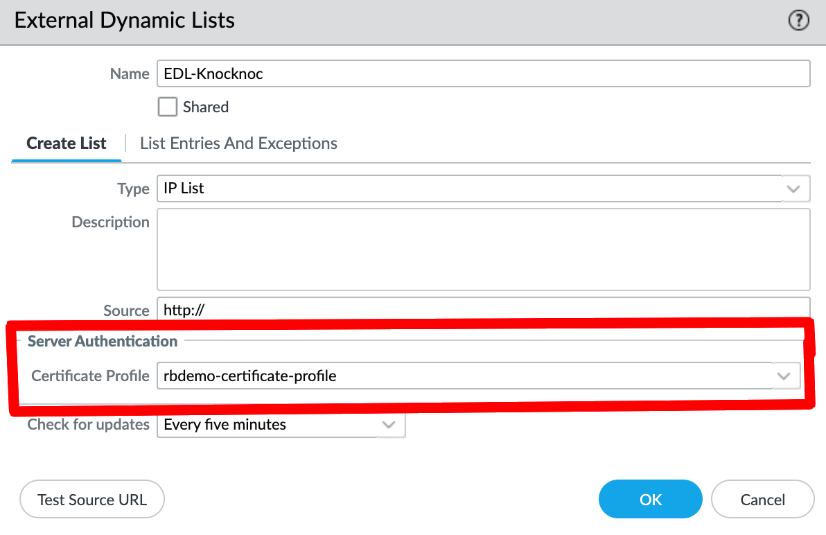 - EDL Configuration: Configure the Palo to point the EDL to the Knocknoc server. You also need to extract the server CA/chain for the Palo to verify the server.
