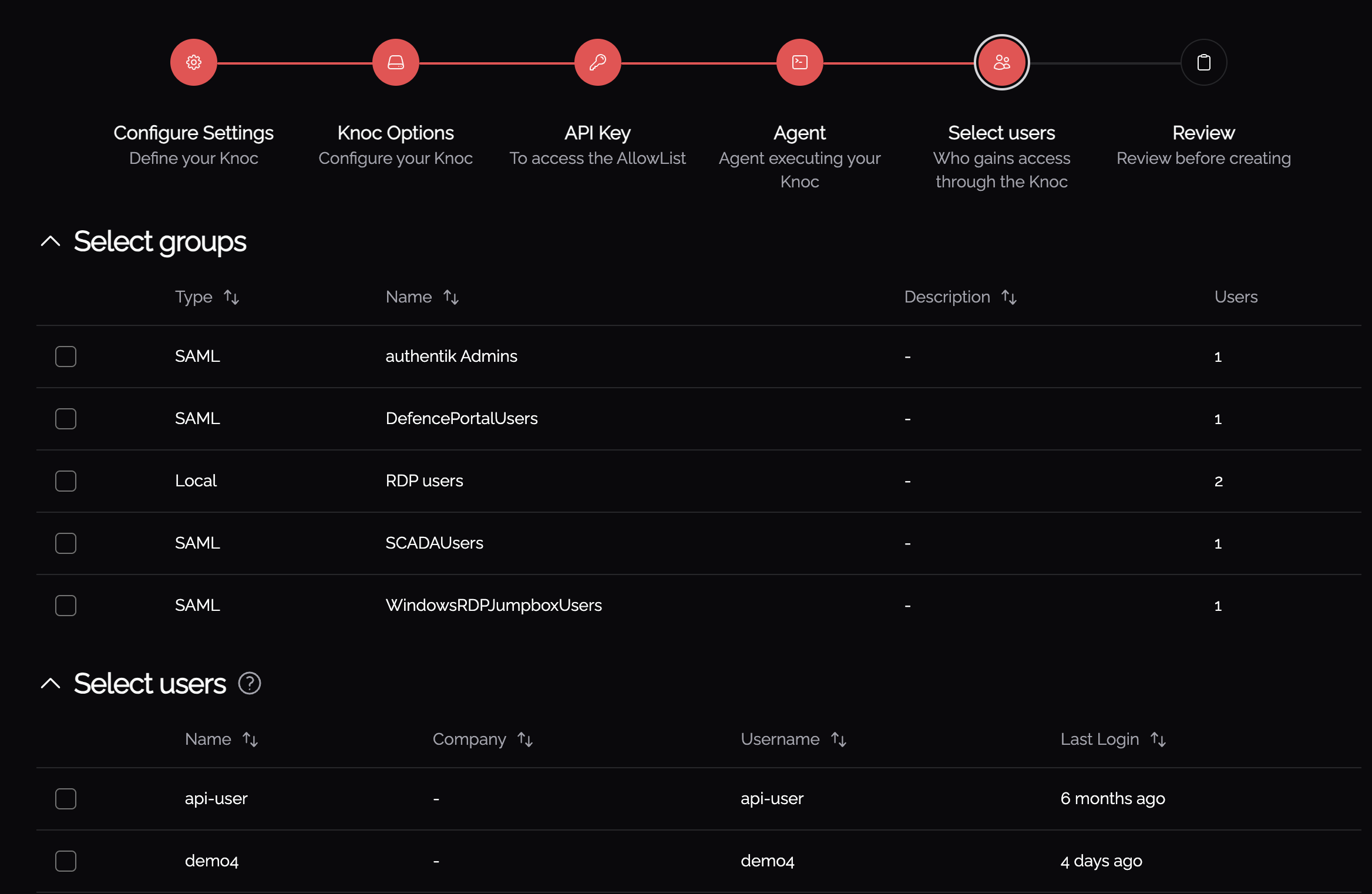 Back in Knocknoc, assign the relevant users/groups to the Knoc, and submit the final configuration.