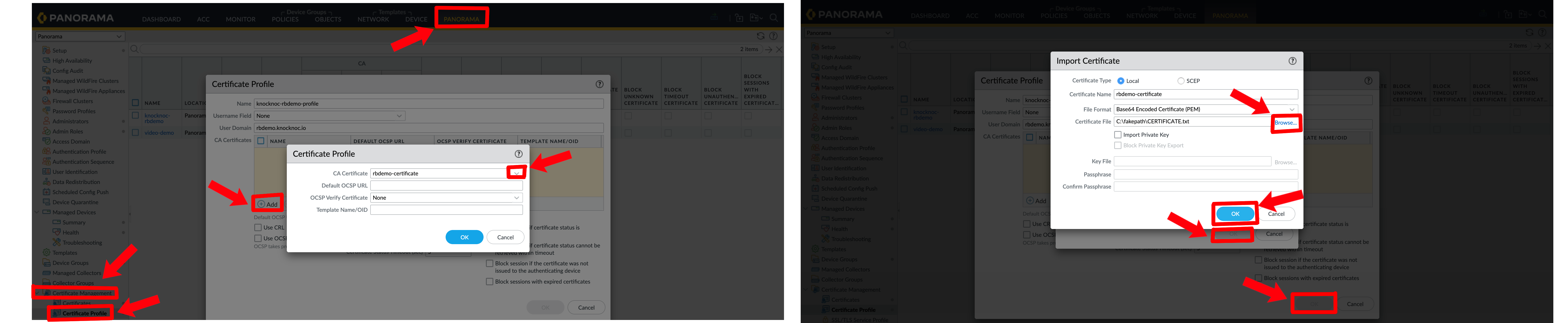 Panorama - Certificate Manager --> Certificate Profile --> Add --> Add --> CA Certificate Dropdown Menu --> Certificate File Browse --> Commit