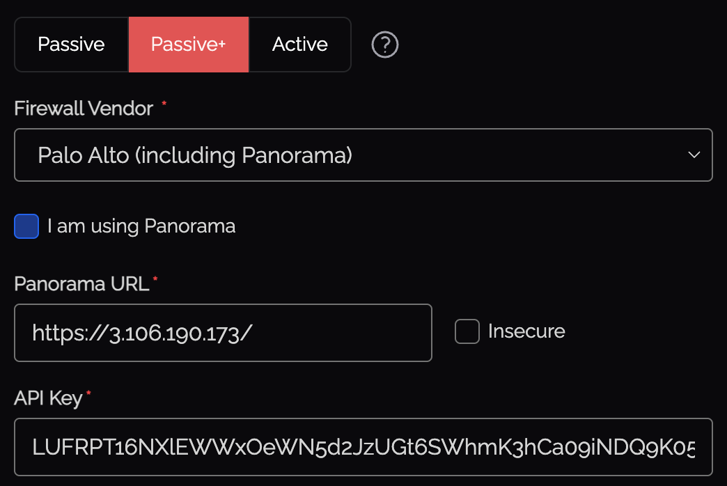 The Palo Alto API key is required to trigger a poll-refresh (in Passive+ EDL mode), or to manage addresses and address groups if you're using Active mode. If you do not want your orchestration agent to talk to your firewall or Panorama, you can use Passive mode.