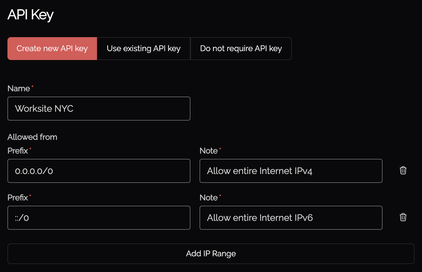 - Set any IP allowlisting restrictions - this is the IP of the firewall. Note the firewall will be polling/retrieving the EDL, even with a Panorama in place. Naturally we recommend removing the "entire Internet" rules and being more specific. These IP restrictions can be edited later through the API keys section.