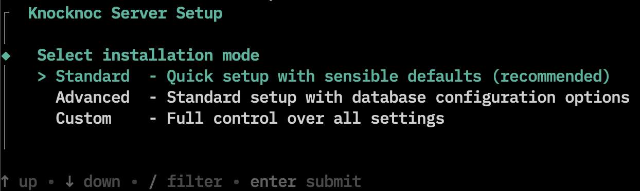 This method is exactly the same as "Standard", except it allows more control over the database configuration of Knocknoc. You may choose between: