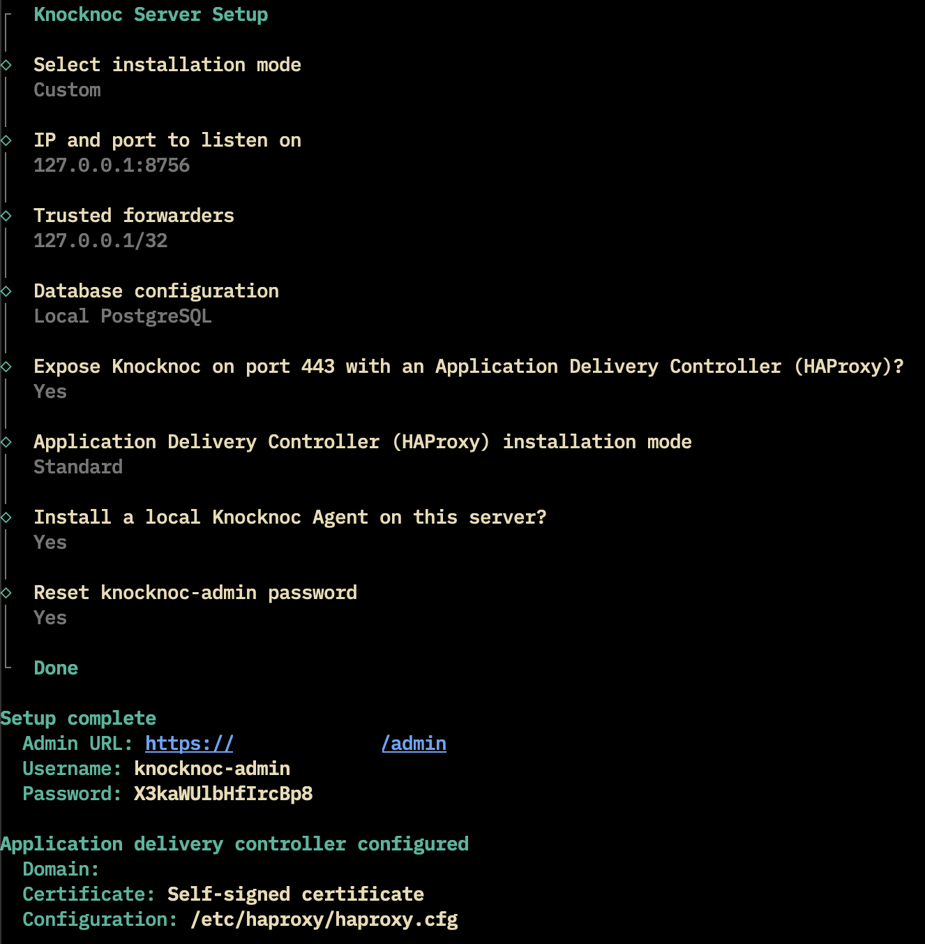 Expose Knocknoc on port 443: This indicates that you'd like to install and set up the Application Delivery Controller (HAProxy). Further configuration options will be collected if you select 'yes'.