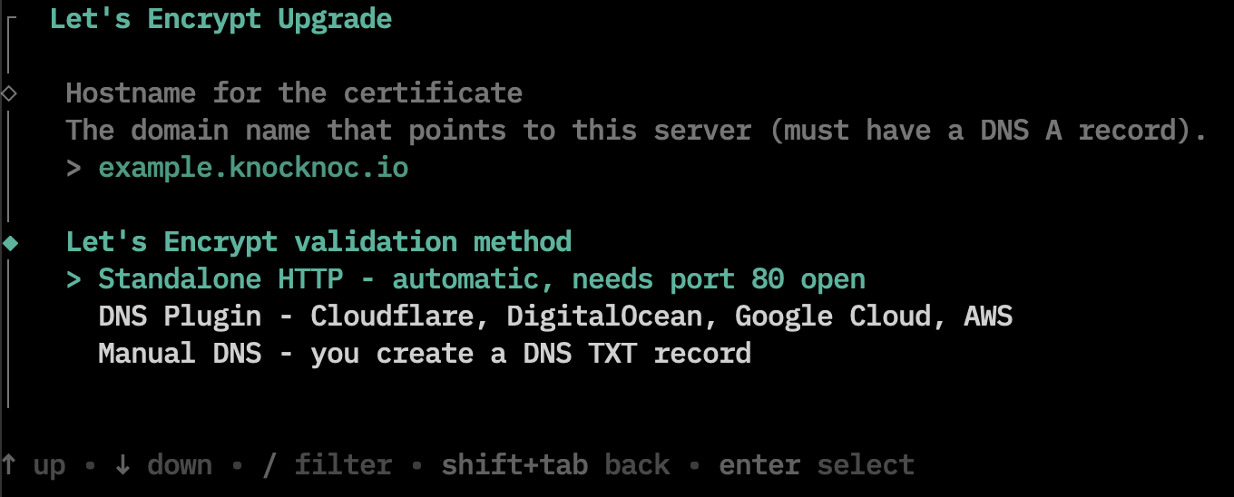 Then you will be prompted to selection a Let's Encrypt Validation method: