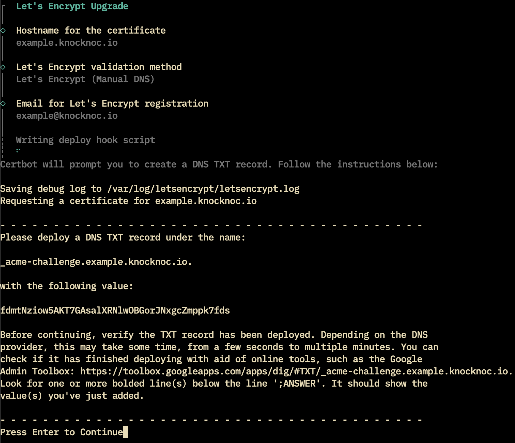Follow the instructions provided in the setup to obtain a signed certificate for your domain.