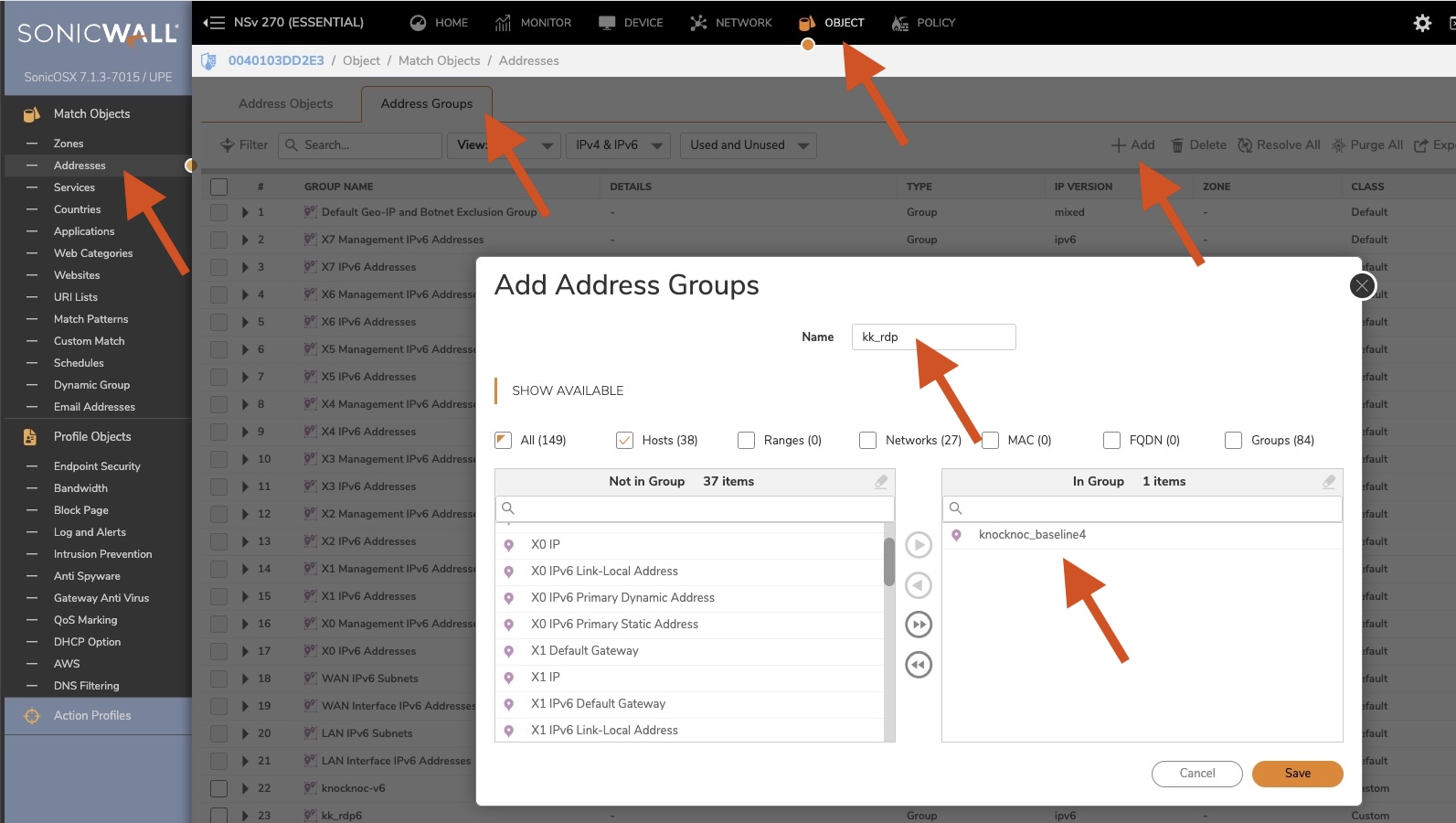 First we create a baseline host address, Sonicwall requires an entry in the address-group lists as a baseline.