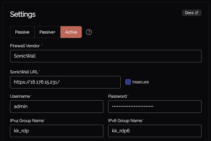 Passive - Knocknoc's Allowlist feature provides a passive integration with firewalls that support polling for IP address lists, Sonicwall calls these Dynamic External Address Groups or DEAGs. This feature pulls from the Knocknoc server a list of IPs of authenticated users, in the correct group/for the assigned firewall policy. The drawback of this feature is that the list can only be fetched every 5 minutes in the case of a Sonicwall.