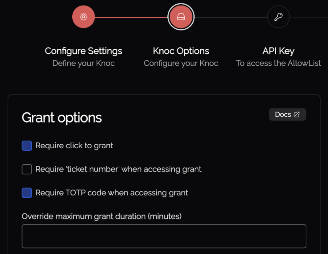For additional security and identity verification, Knocs support a "Require TOTP code when accessing grant" option.