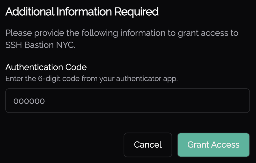 Once 2FA is configured, granting access will prompt for the current authentication code each time a grant is requested: