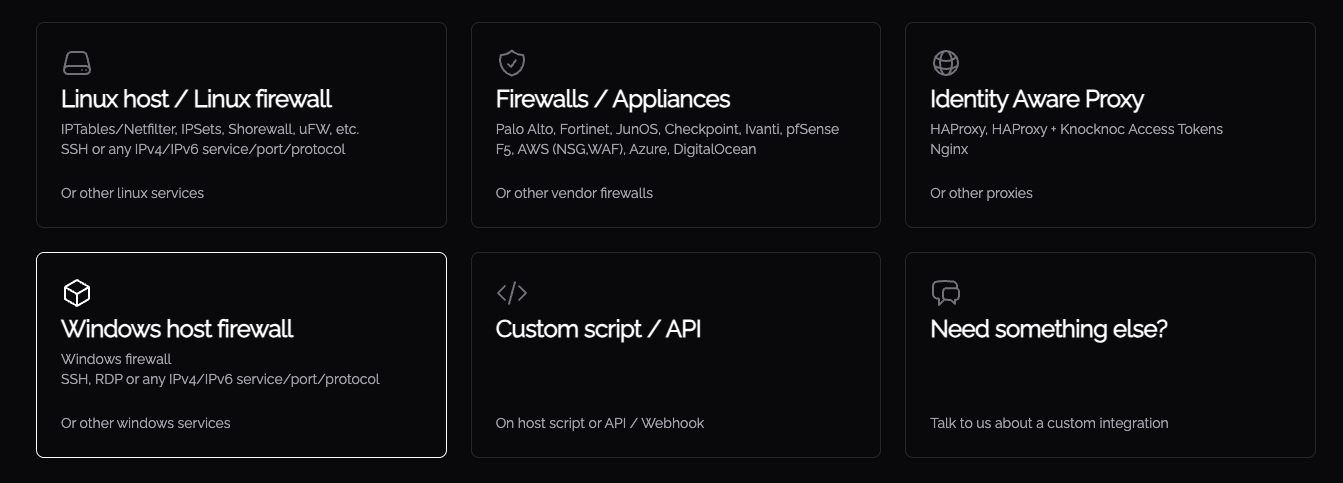 You can now orchestrate third-party firewalls from Microsoft Windows using the Knocknoc Windows orchestration agent. Spin up the Knocknoc SaaS server and remove external attack surface in 15 minutes using the Windows Agent and an existing in-line or appliance based firewall. Simple but very effective. Install the Windows Agent here.
